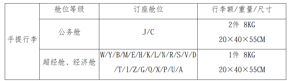 2.手提行李标准:是指旅客自行负责照管的且可带入客舱的行李,单件重量不能超过8千克且体积不能超过20×40×55厘米,如超出以上标准需办理行李托运。